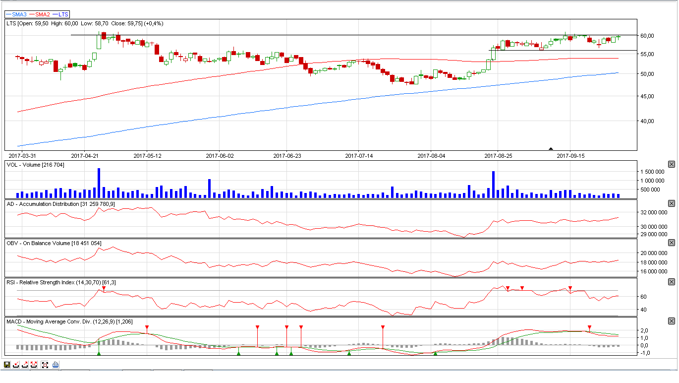 Spółka od kilkunastu sesji porusza się w konsolidacji między poziomami 56-60 zł. Możemy zaryzykować i zagrywać już po przebiciu 60 zł albo bezpiecznie dopiero po przebiciu 61 zł. Poziomy 60 zł i 61 zł odznaczają się w arkuszu dużą ilością akcji na S.