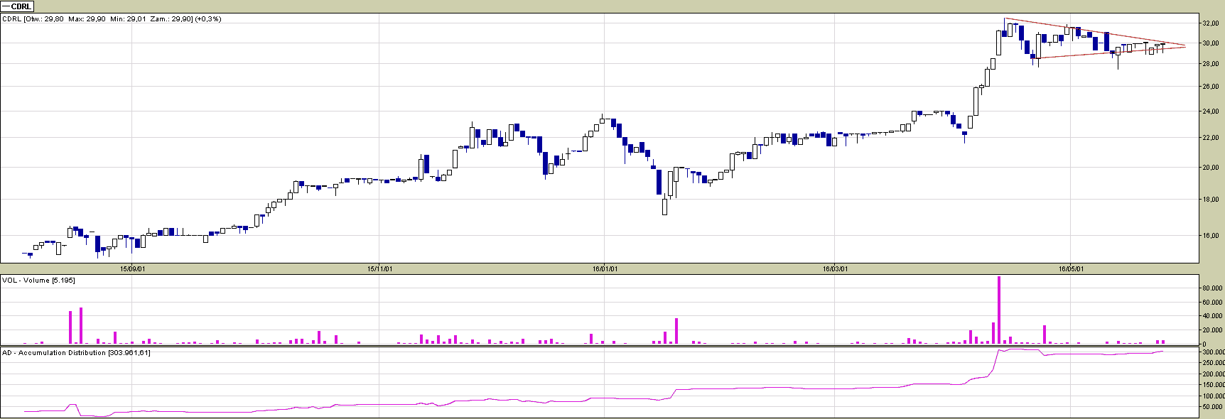 CDRL znajduje się w mocnym trendzie wzrostowym, który napędzany jest przez rządowy program 500+. Na wykresie wykształciła się formacja chorągiewki, która z czasem stała się trójkątem symetrycznym. Zagranie nad wybicia z górnego ramienia trójkąta jest dobrym momentem do podpięcia się pod kontynuację wzrostów.