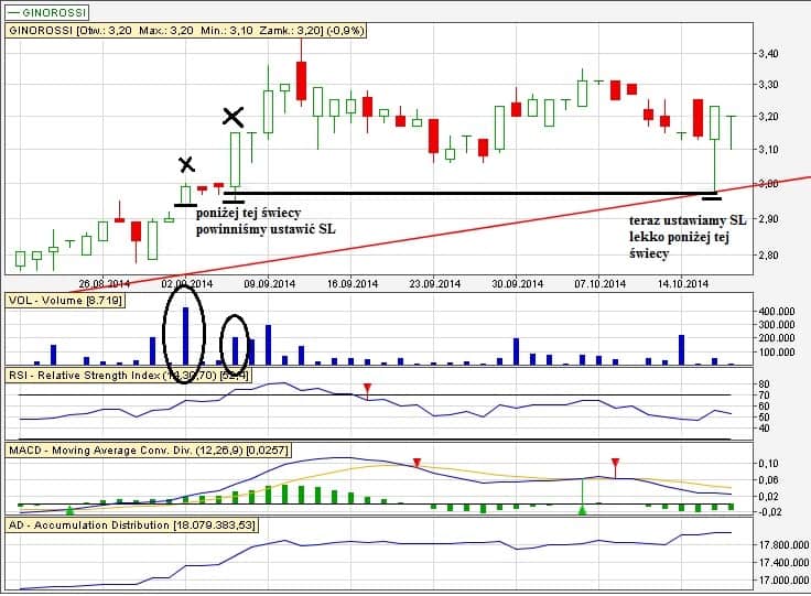 Jak najlepiej ustawiać Stop Loss (zlecenia obronne – automatyczna aktywacja zlecenia sprzedaży, jeżeli walor spadnie poniżej danego, wcześniej ustalonego pułapu) pisaliśmy w strefie dla zarejestrowanych użytkowników. Niedawno odbiliśmy się od linii trendu wzrostowego (jedyne co mi przeszkadza to za mały wolumen). Jednak tutaj można śmiało ustawić ciasny SL (przykład pokazany na wykresie), więc śmiało można zainwestować.