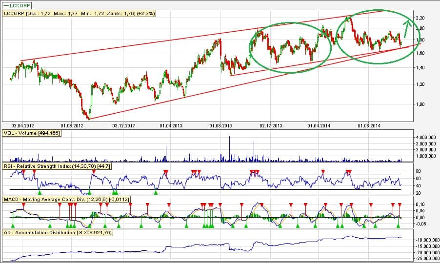 Ostatnią spółką, którą chcę dzisiaj pokazać, to LCCorp. Równiez wieloktrotnie przez nas omawiana spółka. Jeden z zarejestrowanych użytkowników zwrócił uwagę na spory wolumen na piątkowej sesji. I miał rację. Widać, że linia trendu jest respektowana i jest to myślę dobry moment na zakup akcji. Również trzeba zauważyć, że prawdopodobnie powtarza nam się schemat z poprzedniego, zaznaczonego kółka.