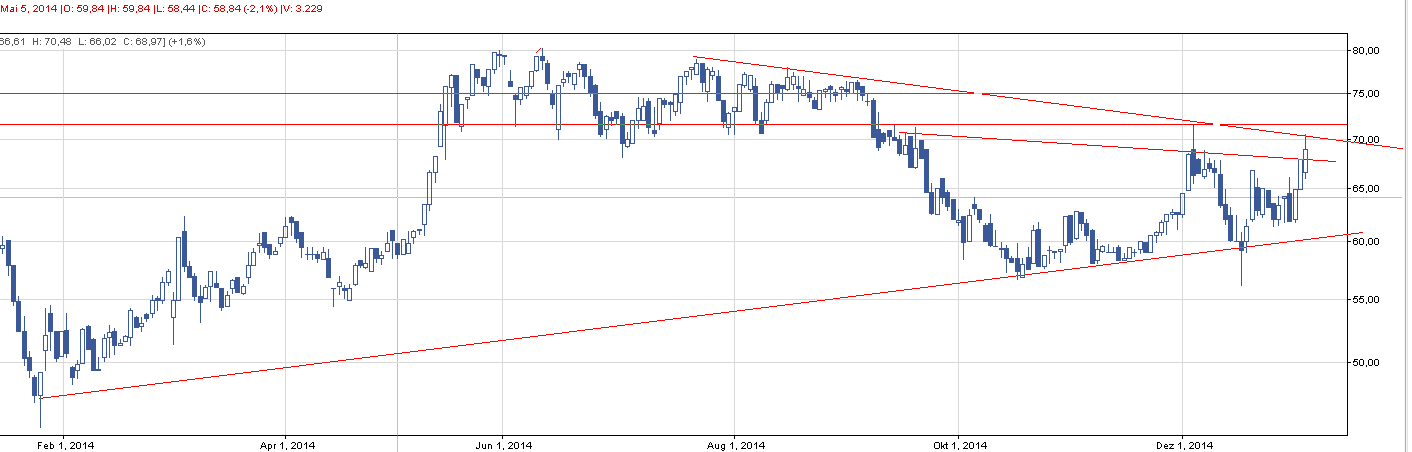 Trend niby wzrostowy, ale od jakiegoś czasu ma problem z przebiciem się na wyższe szczyty. Tak też było dzisiaj. Kurs ostatnio odbił się od wyznaczonej linii trendu wzrostowego, ale zatrzymał go świeższa linia trendu spadkowego. W obecnej sytuacji widzę dwie konstelację: wzrost do najbliższego oporu, tj. ok. 72 zł, 75 zł albo konsolidacja w zakresie dwóch trendów.