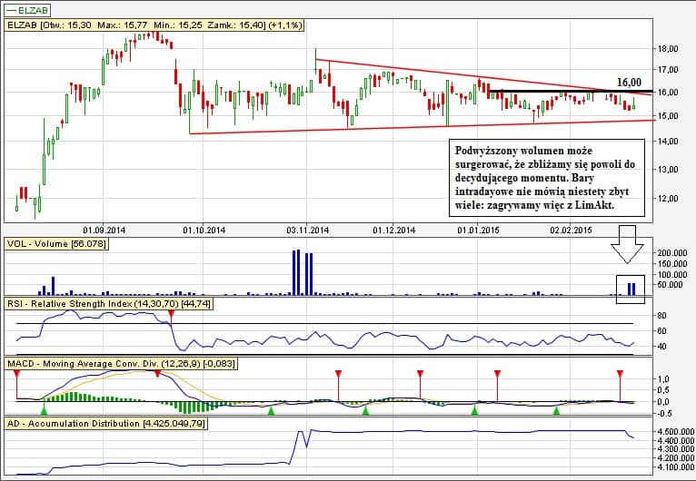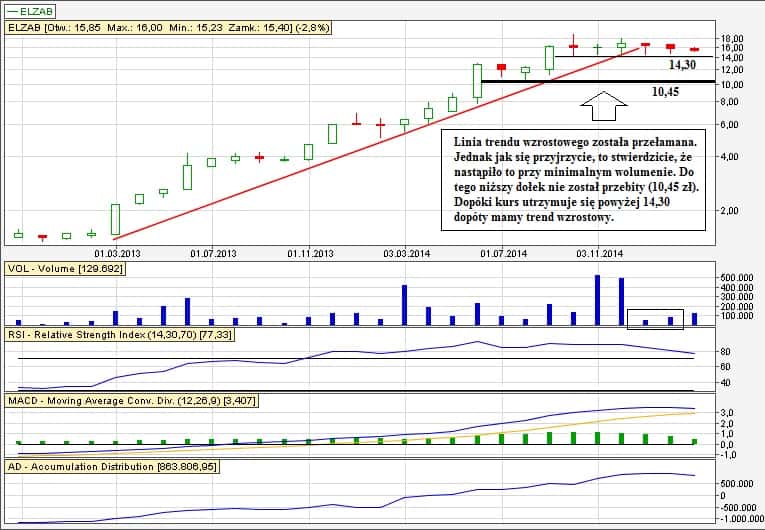 Dzisiaj do listy dorzucam Elzab (jeden z użytkowników prosił o zwrócenie uwagi). Zagrywamy tradycyjnie pod wybicie z formacji w spółce o trendzie wzrostowym: