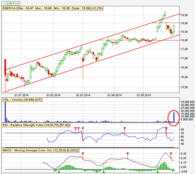 Jako że mamy spokojny i słoneczny weekend, to dzisiaj przedstawię spokojną, ale optymistyczną analizę spółki Energa. Debiut spółka miała dość burzliwy, gdyż był to okres licznych debiutów znaczących spółek na GPW i spółka wystartowała z małym spadkiem ceny. Jednak wbrew pesymistycznym nastrojom z początku, spółka spokojnie pnie się małymi kroczkami tworząc przy tym silny kanał trendu wzrostowego. Po małych spadkach to właśnie na dolnej krawędzi trendu kurs się zatrzymał i odbił przy dużym wolumenie. Utworzyła się przy tym świeca z długim zielony korpusem, co przy dużym wolumenie ma pozytywny oddźwięk. Z tego powodu jest duże prawdopodobieństwo, że opór w postaci “luki cenowej” (jednakże sztucznej, utworzonej przez odcięcie ceny dywidendy) zostanie dość szybko przebity (19 zł).