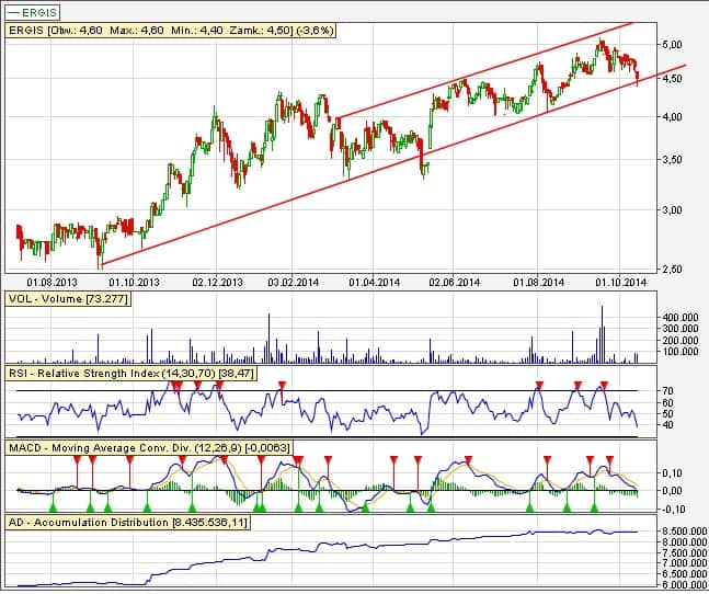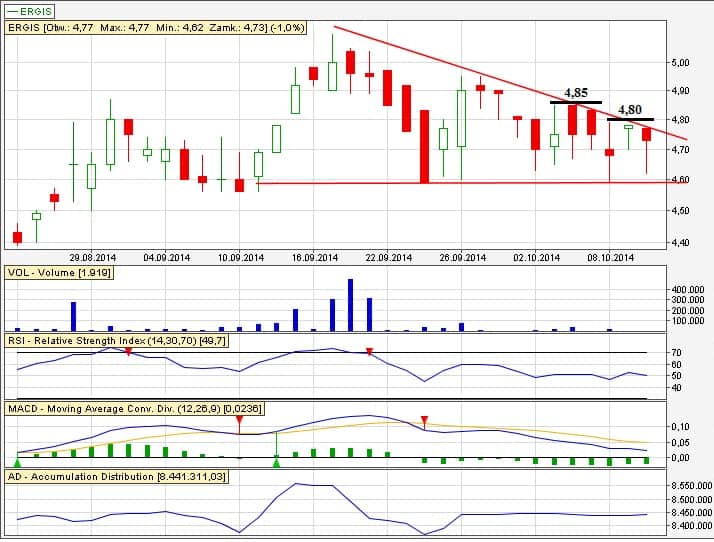 Tak, na Ergis nastąpiło wybicie dołem. Jeżeli kurs wybroni narysowaną dolną linię trendu, to jeszcze nic straconego. O zmianie trendu na spadkowy jednak będziemy mogli dopiero mówić po przebiciu 4 zł (jako niższa sekwencja).