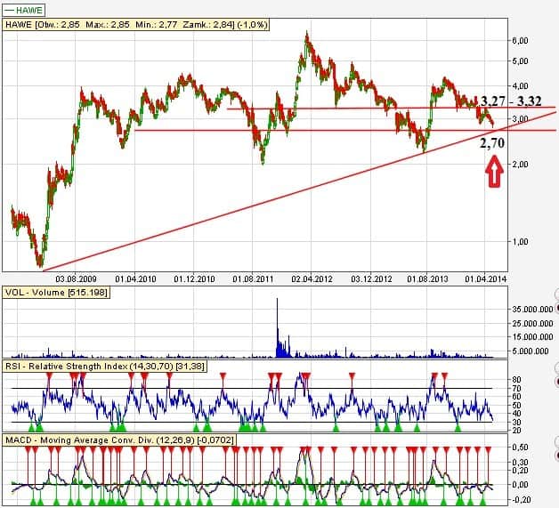 Kurs akcji Hawe znajduje się aktualnie koło mocnej linii wsparcia 2,70 zł. Po paromiesięcznej, książkowej dystrybucji (krótkoterminowy trend spadkowy, w ogólnym, długoterminowym trendzie wzrostowym) jest to dobry czas na zakup akcji. Stale zmiejszające się obroty w trendzie spadkowym sygnalizuje zakończenie dystrybucji. Jedyny mankament to aktualna sytuacja na giełdzie, której nie trzeba raczej nikomu przedstawiać – powolne odpływanie kapitału z giełdy może zdziałać swoje. Po przebiciu punktu 2,70 jest ryzyko zanurkowania kursu do dolnej linii kanału konsolidacyjnego na poziomie 2,50 zł. Dobra sytuacja fundamentalna spółki powinna jednak być dobrym amortyzatorem.