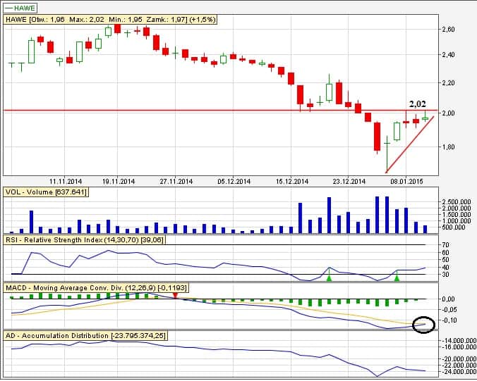 Również wiele innych spółek wzrosło w tym tygodniu, jednak obszerniejsze podsumowanie zrobimy jak zwykle po jakimś czasie. Przejdźmy do jednej z najbardziej szumnych spółek jaką jest Hawe. Wczoraj wzrosty sięgały nawet +13,4%, żeby skończyć “jedynie” na +1,55%. Spółka “popularność” zyskała pod koniec 2011 roku, gdy wzrosła z 2 złotych do 6,40 zł w kilka miesięcy. Później nadzieje inwestorów ponownie rozpaliła zwyżka w 2013 roku z 2,20 zł do 4 zł w … miesiąc! Od tego czasu inwestorzy – pamiętając wspomniane okresy – szukają nagminnie dołków, które dadzą ponownie zyskać spore procenty. Momentów potencjalnych zmian trendu było dużo i pisaliśmy o nich. Zawsze jednak pisaliśmy, że trzeba poczekać na potwierdzenie, gdyż z trendem spadkowym się nie dyskutuje. Notorycznie pisaliśmy również, że jest tyle innych spółek na GPW (równo 471!), że na razie polecamy darować sobie inwestycję.