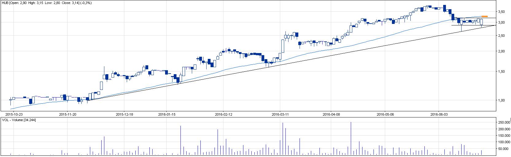 Hubstyle porusza się w średnioterminowym trendzie wzrostowym, a linia trendu jest trwale respektowana – tak było i dzisiaj. Pozytywnie wygląda mała formacja bazy, która porusza się pomiędzy linią trendu, a średnią kroczącą SMA45, która niegdyś także tworzyła wsparcie, a obecnie tworzy opór. I to właśnie pod przebicie SMA45, który stanowi kluczową barierę w formacji bazy, będzie można zagrywać. Zlecenie obronne znajduje się tuż pod linią trendu wzrostowego. Średni obrót wynosi od 50.000 do 100.000 zł.