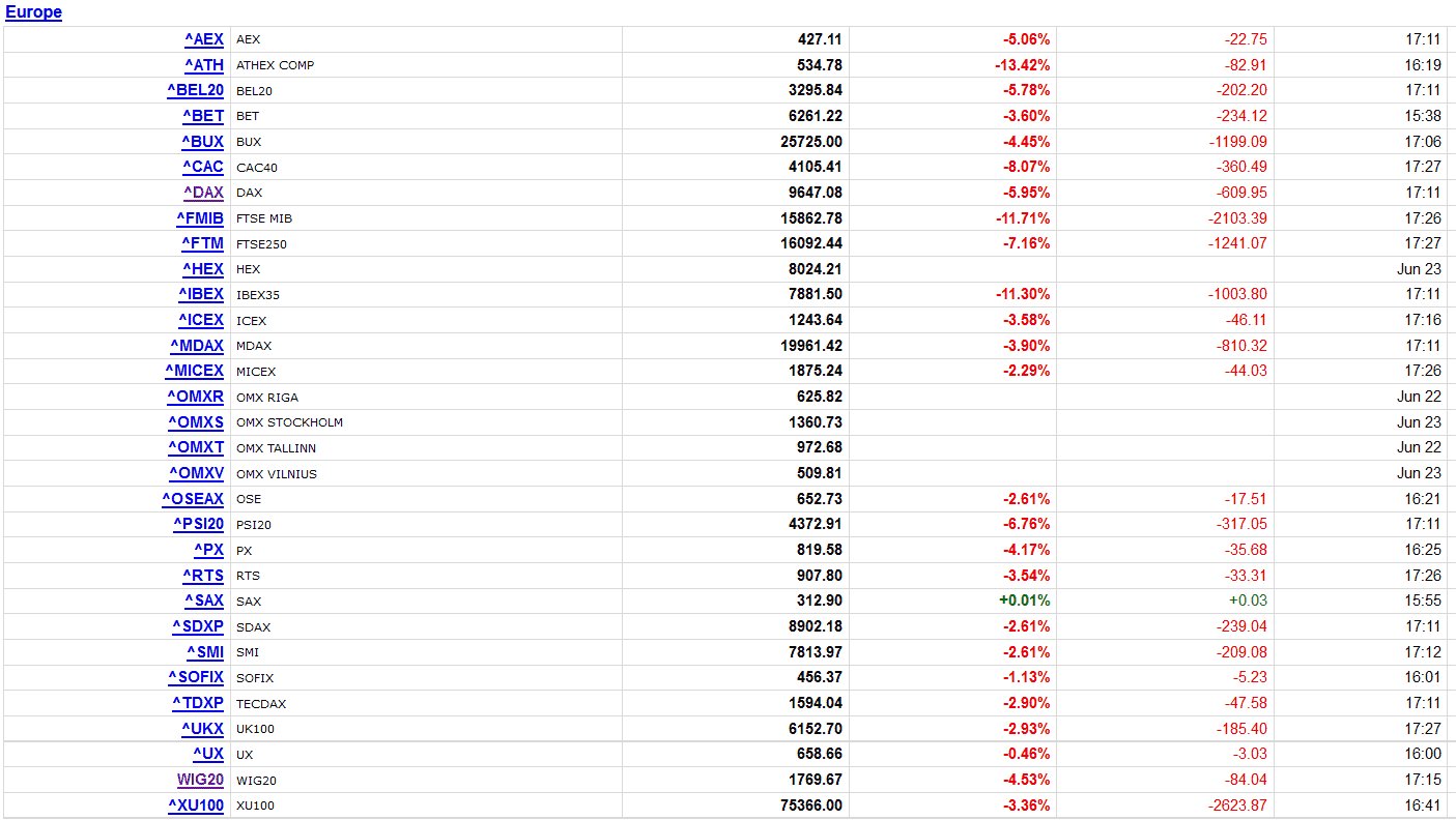 Na tle Europy wypadamy przeciętnie. Znacznie gorzej od naszego parkietu zachował się indeks grecki, hiszpański czy włoski, które zakończyły piątek z ponad 10 % stratą: