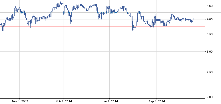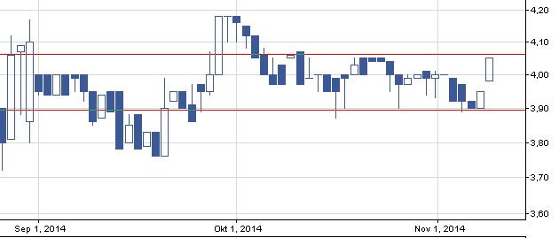 Jest walka z oporem na poziomie 4,06 zł. Poniedziałkowa luka hossy może pozwoli graczom na trochę więcej entuzjazmu na jutrzejszym notowaniu. Jednak jeżeli spojrzymy na wykres z dalszej perspektywy, to zauważmy, że kurs znajduje się od roku w trendzie bocznym. Wcześniejsze wybicia z formacji zawsze powracały do kanału trendu bocznego.