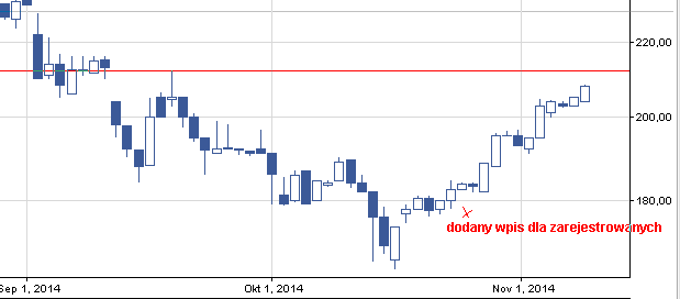 We wpisie z 26.10 zalecałem rzucić okiem na wykres Mdg. Kurs od tamtego czasu urósł ok. 13 % i przychodzi zadać pytanie co dalej. Na wykresie wyrysowałem opór wynikający z luki bessy, który był już wcześniej testowany. Po tamtym testowaniu kurs poddał się działaniu byków i zleciał do swojego rocznego minimum. O ile obecny opór nie będzie decydujący, to następny znajduje się już na 226-231, gdzie znajduje się kolejna luka.