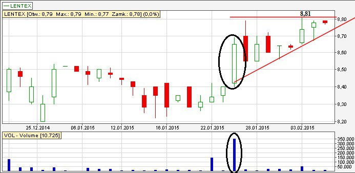 Tworzy się trójkąt zwyżkujący. Przykładowy LimAkt na poziomie 8,82 zł na wybicie z formacji. Jeszcze trzeba dodać, że Lentex jest akcjonariuszem większościowym w spółce Novita. Pakiet większościowy był kupowany w wezwaniu kilka miesięcy temu po 35 zł. Aktualnie jedna akcja Novita kosztuje równo 51 zł. Do tego trend wzrostowy.