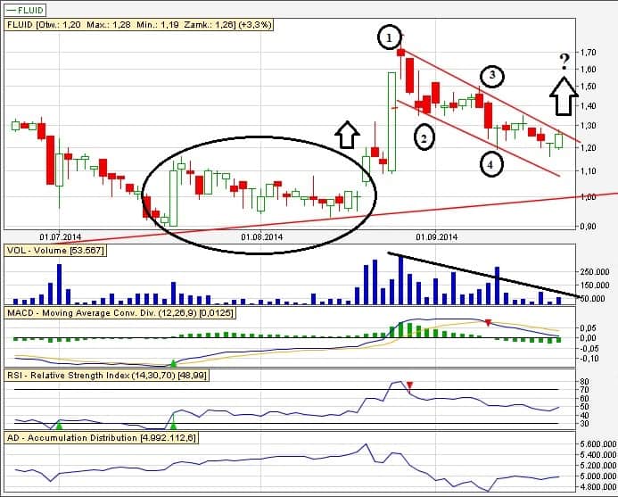 Na tym i na tym walorze nam się tworzy pewna formacja. Lentex głównie dla średnio- i -długoterminowych inwestorów (patrz analizę fundamentalną) z mocnym, długotrwałym trendem wzrostowym. Fluid natomiast jest bardziej ryzykowną spółką: mała spółka z NewConnect, gdzie wszystko może się wydarzyć. Również jednak mamy do czynienia z trendem wzrostowym (patrz analiza). Jednak, że to mniejsza spółka bez ugruntowanej “bazy” radziłbym tutaj grać krótkoterminowo – głównie pod wybicia.