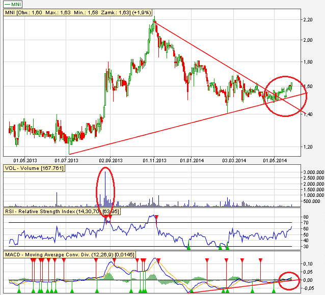 I tak oto zauważamy trzy kółka zaznaczone na wykresie. Pojawił się w końcu krótkoterminowy trend wzrostowy  oraz linia trendu spadkowego (krótkoterminowego) została przełamana. Drugi punkt to największy wolumen od 2009 roku na bardzo długiej wzrostowej świecy: świadczy to naturalnie o wielkim popycie w tym dniu. Nie zapominajmy, że cena wtedy wynosiła niemal tyle samo, co aktualnie (1,63). Trzecie koło to oczywiście pozytywna i przez wszystkich techników lubiana dywergencja MACD i jednocznieśnie przecięcie poziomu zerowego. Należy mocno obserwować wykres, gdyż wygląda obiecująco. Radziłbym jednak poczekać na przebicie oporu na wysokości 1,70 zł (nie jest zaznaczone na wykresie, żeby nie robić zbytniego bałaganu). Będziemy informować na bieżąco.