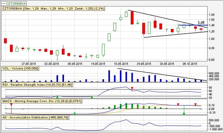 Rysuje nam się wyraźna formacja techniczna trójkąta symetrycznego (potwierdzona wolumenem). Tutaj czekamy jak na razie na przebicie 1,40 zł. Sytuacja jednak zmienia się diametralnie i prawdopodobnie jeszcze będziemy aktualizować.