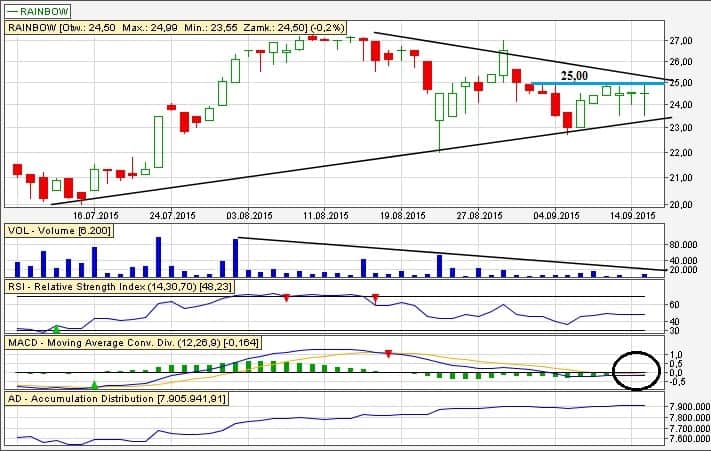 Rainbow: długoterminowy trend wzrostowy nadal w grze, ale wspomniany przez Michała sygnał kupna na MACD został szybko zmieniony na sygnał sprzedaży. Pokusiłbym się o lekkie obniżenie LimAkt nad małą lukę spadkową, tj. 24,8 zł.