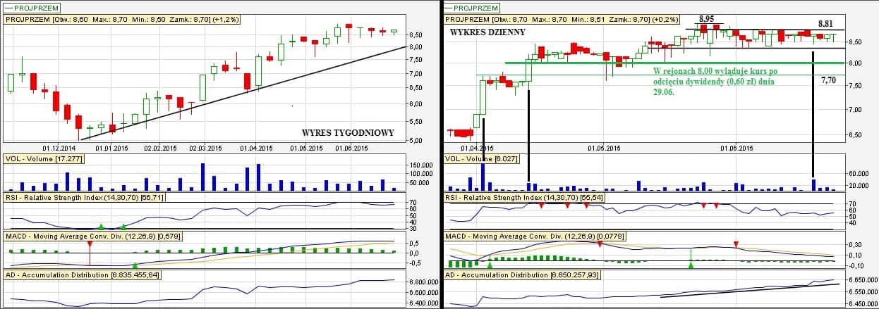 Spółka również w trendzie wzrostowym. Trend ten tworzy między innymi Quercus, który od kwietnia tego roku wchodzi w spółkę (link do informacji). Aktualnie nam się tworzy ciekawa konsolidacja. Jedyne co namiesza, to nadchodzące prawo do dywidendy (dywidenda). Prawo do dywidendy zostało uchwalone na nadchodzący wtorek 30.06. Stopa zwrotu z dywidendy wyniesie niebagatelne ~7%. Jeżeli chcemy się teraz załapać na dywidendę, to musimy zainwestować do piątku (na zakończenie sesji). Statystyki jednak wyraźnie mówią, że kilka dni przed dywidendą nie opłaca się inwestować. Po odcięciu dywidendy (w tym przypadku o 0,60 zł) kurs statystycznie jeszcze lekko spada. Po odcięciu kurs wyląduje w rejonach 8,10 – 8,00 zł. Osoboście bym polował na akcje w rejonach 7,70 – 8,00 zł. Postaramy się jeszcze powiadomić.