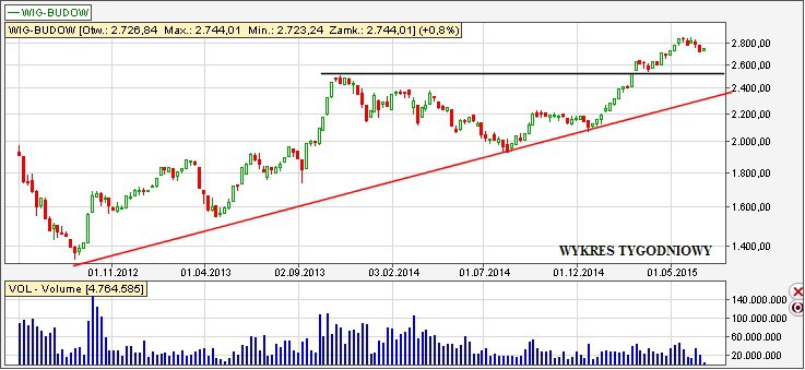 W poprzednim roku typowaliśmy branżę budowlaną jako najbardziej perspektywiczną pod nasze giełdowe wzrosty. W dalszym ciągu podtrzymujemy te zdanie. Dlatego w tym wątku wymienię dwa typy (podawaliśmy je już w kwietniu, jednak obie ponownie znajdują się przed potencjalnymi sygnałami kupna), które moim zdaniem mają największy potencjał na dalsze wzrosty. Jednak przed podaniem dwóch spółek chciałbym pierw zaprezentować wykres indeksu WIG-Budowlanka: