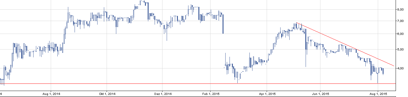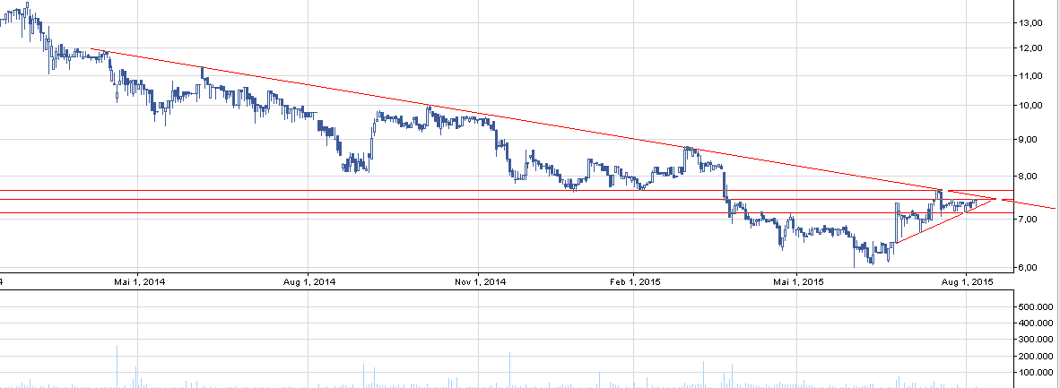 Na drugim, oddalonym w czasie wykresie widzimy, że powyższy trójkąt zwyżkujący może jest tylko korektą wzrostową w długoterminowym trendzie spadkowym. Linia zniżkująca jest respektowana, a my znajdujemy się obecnie dokładnie tuż pod nią. Punktem zwrotnym dla spółki będzie zatem utrzymanie pozycji w korekcie wzrostowej oraz przebicie się przez linię zniżkującą na poziomie ~7,5 zł. Dla zainteresowanych walorem zapraszam do lektury świeżego raportu za pierwsze półrocze 2015 r.
