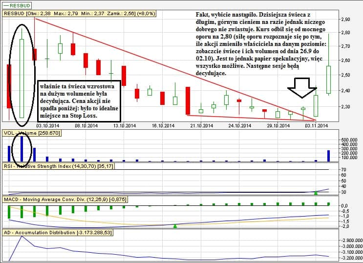 Dwa zdania ode mnie dotyczące spółki: linia trendu spadkowego została lekko przerwana, jednak nie możemy jeszcze mówić o zmianie trendu. Dalej panuje trend spadkowy. Ładne świece/sesje z 16.10 i 29.10 dają jednak spore nadzieje. Powodzenia w inwestycji!