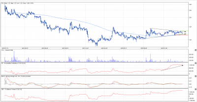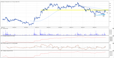 Komentarz: Spółka z niskim obrotem dziennym, ale trwająca nad kluczową średnią kroczącą SMA200. Z perspektywy trzech – czterech miesięcy tworzy się trójkąt symetryczny wskazujący na akumulację na wskaźnikach AD oraz OBV. Bezpieczniejszym wyjściem będzie zagranie na wybicie z trójkąta. Zagranie dla osób poszukujących przygód z robieniem kółek, to zagranie na utrzymanie SMA200 i ew. realizowaniu pozycji przy górnym ograniczeniu trójkąta.