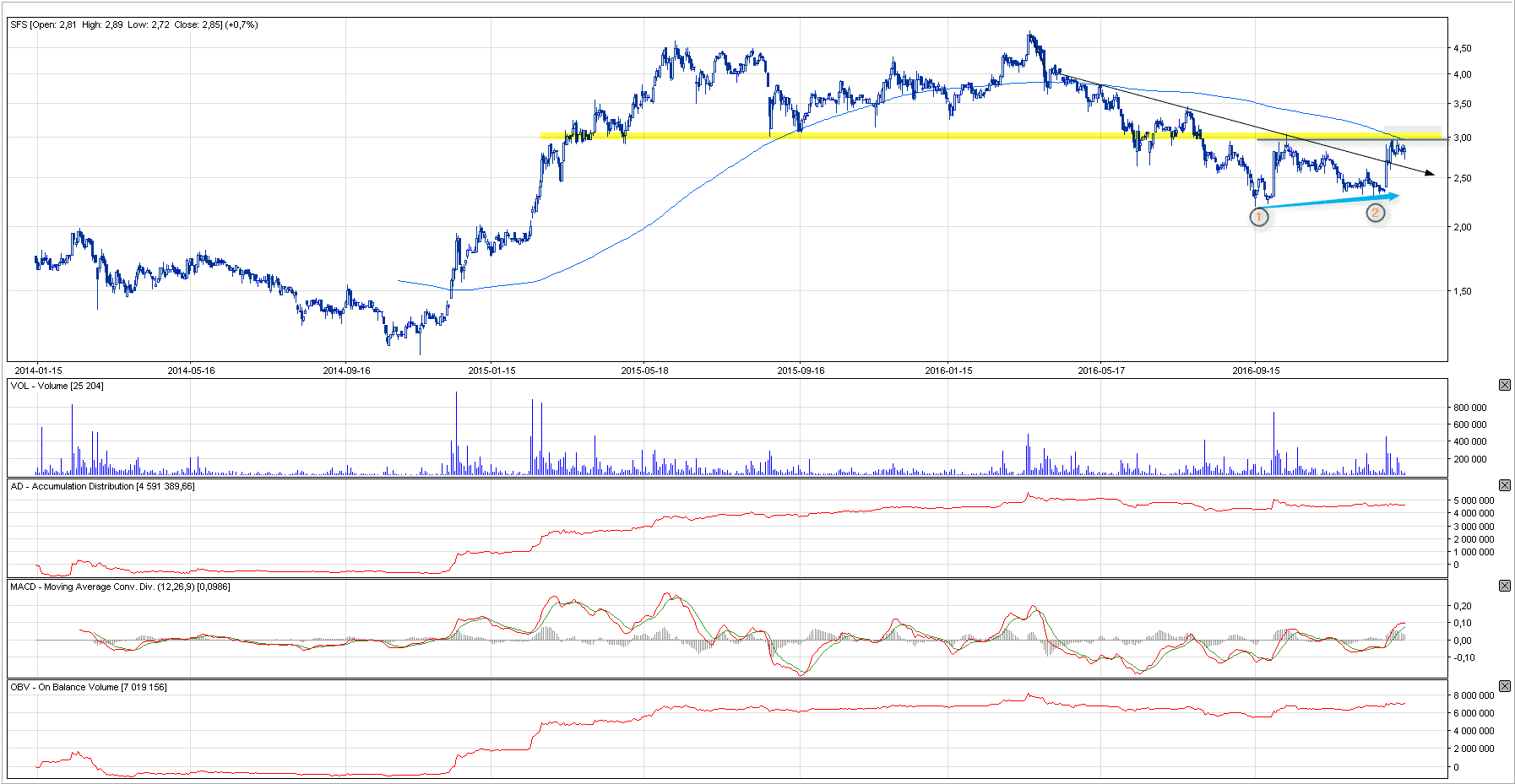 Komentarz: Sfinks znajduje się w potencjalnej realizacji scenariusza prowzrostowego. Na wykresie widoczna jest formacja brzydkiego podwójnego dna ((1) i (2)), która zostanie zrealizowana, jeżeli kurs wybije nad 3 zł, czyli szczyt pomiędzy dwoma dołkami. Poziom ten nie jest przypadkowy. Właśnie tutaj przebiega przebita w kwietniu ub.r. SMA200, która w wielu przypadkach cechuje trend wzrostowy. 3 zł to także poziom wsparć i oporów, a zgodnie z zasadą zmiany biegunów obecnie te 3 zł tworzy opór. Wykres trafia na tapetę dzięki przebitej pod koniec grudnia krótkoterminowej linii trendu spadkowego – jest to przesłanka do tego, że formacja podwójnego dna ma szansę na powodzenie.