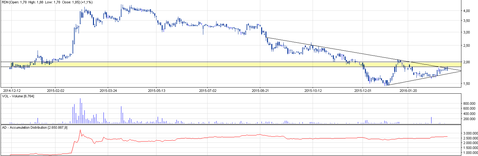 Ostatnim razem wspominaliśmy o Redanie na początku stycznia z przykładowym LimAkt na 1,77 zł, a przedtem, gdy jedna akcja kosztowała 1,5 zł (dla grona premium). Na tę chwilę (1,85 zł) kurs spółki tworzy trójkąt symetryczny, z czego górna linia jest zdecydowanie dłuższa od dolnej, co oznacza, że znajdujemy się w trendzie spadkowym. Istnieją jednak pewne przesłanki do zmiany trendu niedźwiedzia:
