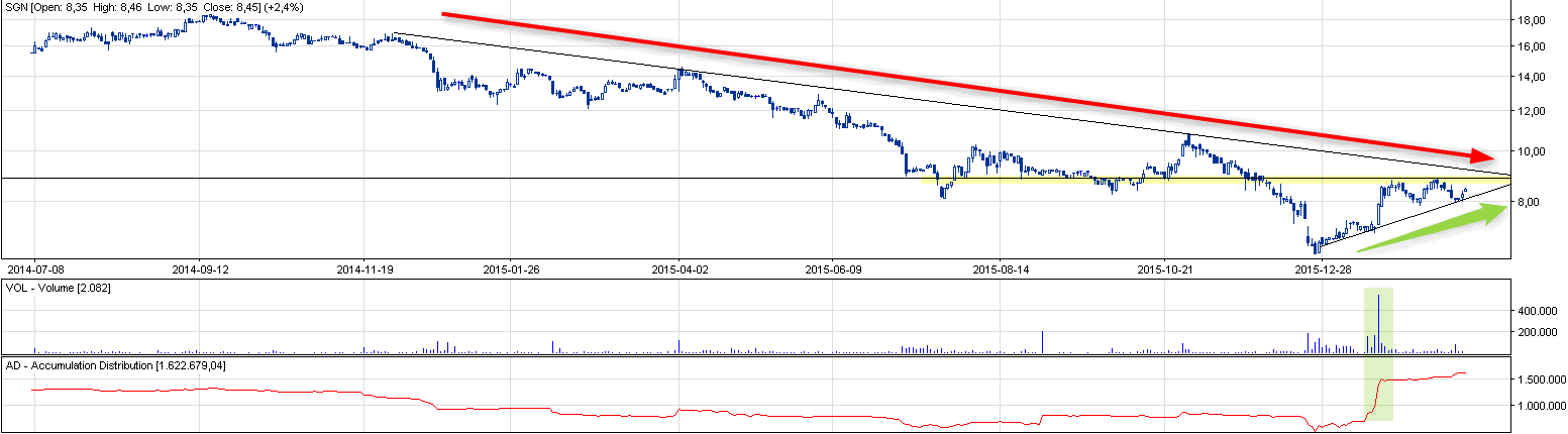 Na pierwszy rzut oka za wiele nie różni wykres spółki Sygnity z powyższym wykresem spółki Redan. W obydwu przypadkach mamy do czynienia z głównym trendem zniżkującym, który krótkoterminowo przeżywa pewne przekwitanie oraz ma predyspozycje do metamorfozy w coś nowego. Sygnity wykazało parę tygodni temu jeden z najwyższych obrótów od ponad 5 lat. Po wskaźnikach AD/OBV stwierdzić można, że doszło do mocnej akumulacji papiera, co jest dobrym argumentem za zakup papiera. Głównym minusem jest jednak bardzo niski poziom płynności, który wynosi paręnaście tysięcy złotych dokonanych na raptem 8 transakcjach.
