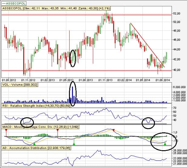 Co się rzuca w oczy, to wybronione wsparcie na poziomie 40 zł. Siła wsparcia definiowana jest przez zwiększony wolumen, a więc między innymi przez zaznaczoną historyczną świecę (nie było jeszcze na żadnej sesji w historii tego waloru takiego wolumenu – ponad 6 milionów akcji zmieniło właściciela). Linia spadkowa w kanale konsolidacyjnym również została przełamana (narysowana z uwzględnieniem luki odcięcia dywidendy, rysując bez luki linia oczywiście również została przerwana). Wskażniki również są po stronie kupujących: odbicie się od punktu 30 na wskaźniku RSI oraz przecięcie liń na MACD dawało historycznie mocny sygnał kupna. Jednak patrząc na wykres dzienny: