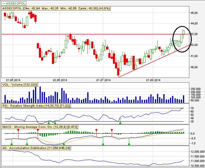 to tutaj wskaźniki wskazują na potencjalną drobną koretkę w krótkim terminie. Punkt 70 na RSI jest kluczowy. Pozytywne jest jednak przełamanie oporu na poziomie 43 zł (o którym już wspominałem), co przemawia za wzrostami w średnioterminowym okresie.