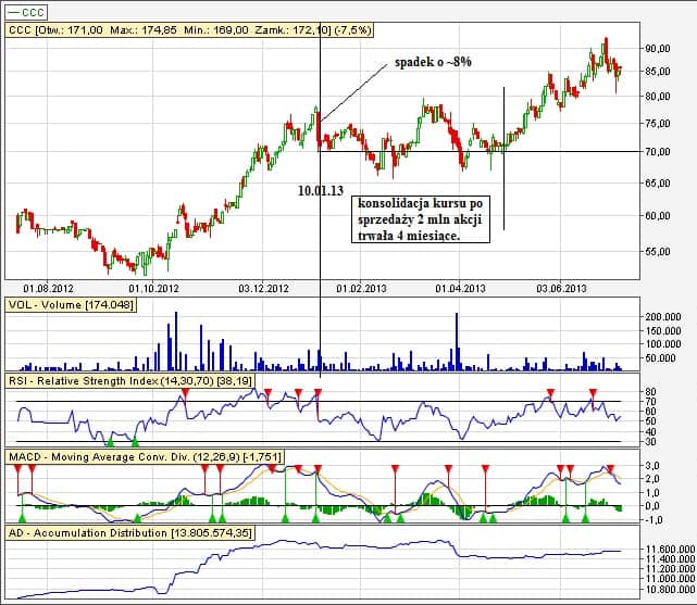 Do podparcia naszej dzisiejszej analizy spółki CCC niezbędne będzie interpretacja zachowania rynku podczas poprzedniej sprzedaży akcji przez Dariusza Miłka. Tak, p. Miłek sprzedawał dnia 10.01.13 podobny pakiet akcji (2 mln) po 70,00 zł. Reakcja rynku na tę informację wyglądała wtedy tak: