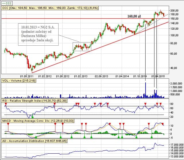 To z kwestii organizacyjnych. Przejdźmy do spółki CCC, która dzisiaj spadła o -7,47%. Taka reakcja rynku odbyła się po niespodziewanej informacji o sprzedaży 3,01 mln akcji przez prezesa i jednocześnie głównego akcjonariusza: Dariusza Miłka. Sprzedaż odbywała się na dzisiejszej sesji w cenie 170,00 zł przez transakcje pakietowe: