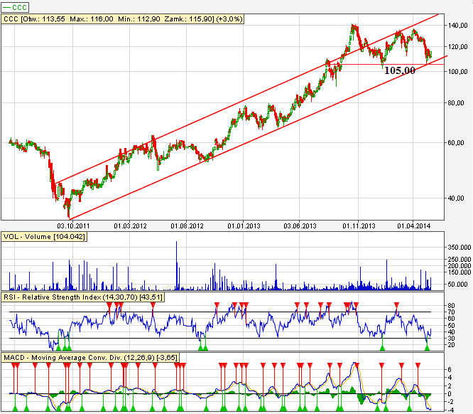 Błażej jak najbardziej ma rację, dla inwestorów krótkoterminowych na walorze CCC sytuacja techniczna jest niekorzystna. Duże prawdobodobieństwo wybicia w dół – więc w tym momencie bym nie inwestował. Jednak nie zapominajmy, że znajdujemy się w mocnym kanale wzrostowym. Dopóki kurs nie przełamie mocnego wsparcia i przy tym dolnego ograniczenia kanału wzrostowego, to dla mnie dalej będzie działał pozytywny scenariusz. Na razie średnio- i długoterminowcy powinni spać spokojnie.