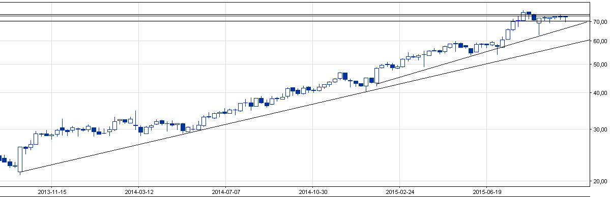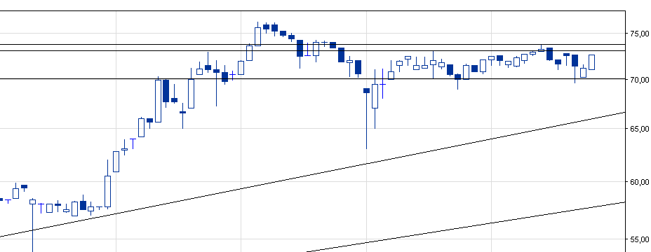 Długoterminowy trend wzrostowy, który znajduje się od dwóch miesięcy w korekcie. Wskaźnik AD wykazuje na mocną akumulację, co z drugiej strony może przełożyć się na bliskie wybicie z oporu 73,03-73,77. Nie należy jednak za wczasu dokupywać akcji, bowiem kurs spółki może niejednokrotnie testować wsparcie na 70 zł; tutaj też należałoby szukać ew. wejścia w walor.