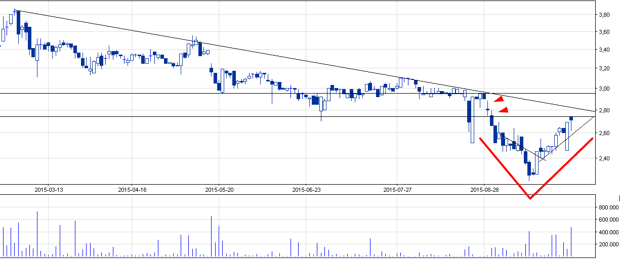 Kurs spółki wykonał niedawno formację typu V; polega ona na szybkim spadku ceny do osiągnięcia wartości krytycznej, a następnie zwyżce do początkowego poziomu. Obecnie znajdujemy się pod istotnymi oporami w postaci bardzo dużej luki spadkowej oraz króktoterminowego trendu zniżkującego. Pewne jest, że przebicie się przez wyznaczone poziomy ruszy kursem w górę, a patrząc na wskaźnik AD, istnieje na to spora szansa. Póki co, nie należy kupować akcji zanim opór nie zostanie przebity; domniemam, że akcje będzie można dobrać po niższej cenie (wariant spekulacyjny).