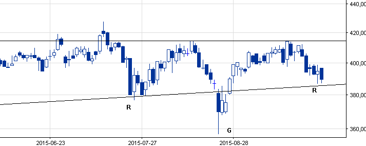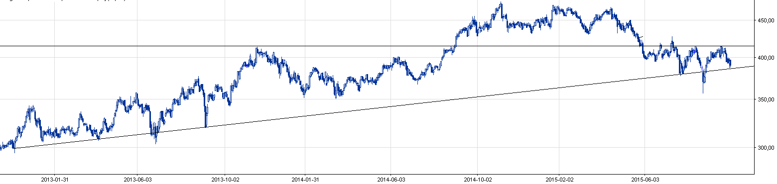 Kurs waloru nadal pozostaje w długoterminowym trendzie wzrostowym, na uwagę zasługuję ponadto możliwa formacja odwróconej głowy i ramion, która jest w fazie kształtowania. Realizacja takiego scenariusza jednoznacznie pchnie kurs w górę, ale póki co spółka walczy o utrzymanie głównego trendu. Wsparcia 386; 380. Opory 415; 427.