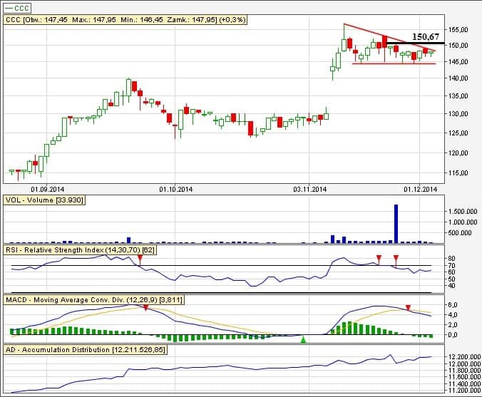 Dzisiaj krótko i treściwie. O CCC już pisaliśmy na naszych łamach wielokrotnie. Nie muszę pisać, że jesteśmy w mocnym trendzie wzrostowym i że już wielokrotnie na tym walorze występowały formacje trójkątów i klinów. Trójkąt nam i teraz się rysuje: