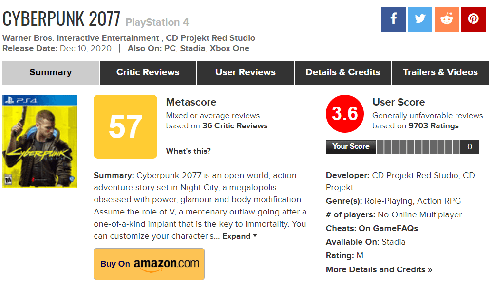Aktualny kryzys zaczął się już w dniu premiery Cyberpunk 2077, czyli 10 grudnia 2020 roku. To wtedy wyszło na jaw, że wersja na konsole starszej generacji jest praktycznie niegrywalna (źródło). O ile oceny wersji na platformy PC były jeszcze w obszarach satysfakcjonujących, to wersje na konsole PS4 oraz XONE dostawały srogie baty. Dzień po premierze oceny graczy w branżowym serwisie metacritic wynosiły dla PS4 jedynie 1,9 punktów. Tydzień później, 20 grudnia, ocena była na poziomie 3,2 punktów. Gra ta była więc jedną z najgorzej wycenianych gier typu “AAA” w historii na platformach PS4.