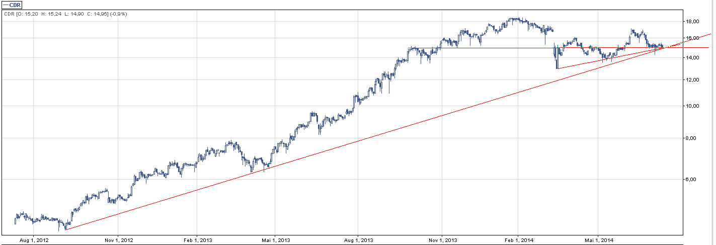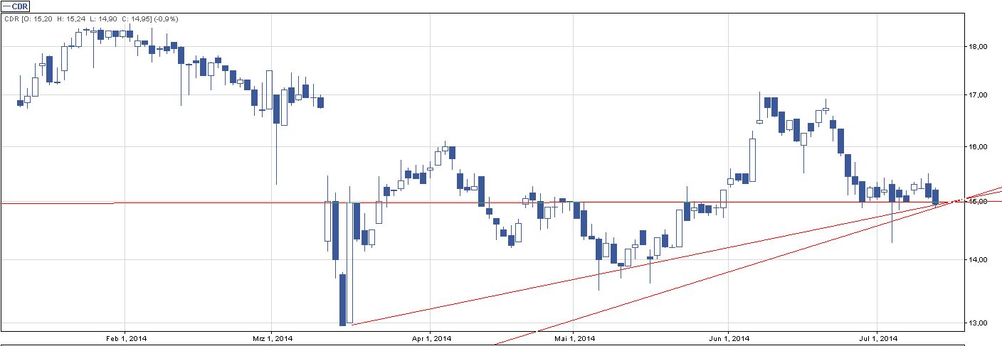 Z AT jest taka zabawa, że tak jak narysujemy linie, tak też będziemy intepretowali wykres. Staram się zawsze znaleźć plusy na wykresie, ale obiektywne podejście jest koniecznościa, nie ma miejsca na sentymenty. Wyrysowałem potrójne (?!) wsparcie, które powinno mieć taką moc, że powstrzyma spółkę przed dalszym spadkiem. Może decydujący przyszły tydzien? Jeżeli uznamy, że WIG w końcu odbija, to można być spokojnym o tę spółkę, która w okresie długoterminowym jest wzrosotwa, ale de facto od 6 miesięcy znajduje się w fazie spadkowej/bocznej. Na koniec: spójrzcie na dłuższy górny cień przedostatniej świeczki… nieraz pisałem co to oznacza.