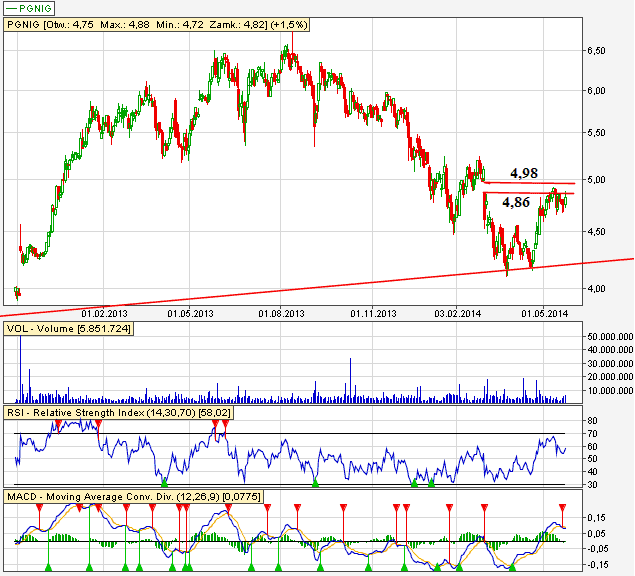Po bardzo silnych wzrostach następuje niemal zawsze gwałtowna korekta, co jest widoczne również na wykresie spółki PGNiG. Kurs jednak zatrzymał się tak, jak to było do przewidzenia: na “linii” trendu wzrostowego. Z zakupem należy jednak poczekać na domknięcie się luki bessy oraz na drobniejszą korektę, gdyż większość wskaźników wskazuje na wykupienie rynku.