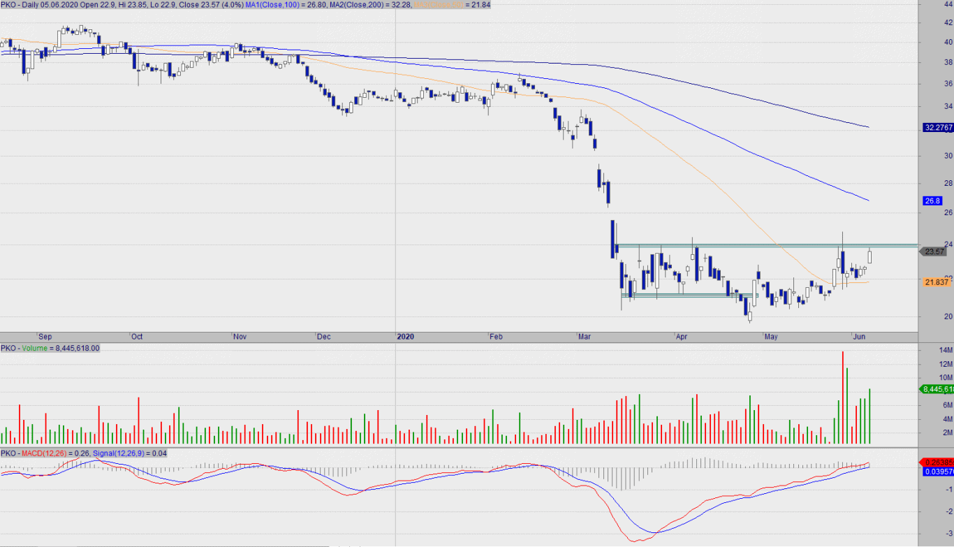 Największy polski bank znalazł się na koniec tygodnia przy oporze na 24 zł, natomiast wybicie 24 zł EOD będzie zaproszeniem do kontynuacji ruchu wzrostowego na lukę spadkową z początku marca oraz na SMA100, które przebiega przy 26,8. Krótkoterminowo popyt trzyma kurs nad linią trendu wzrostowego, tak samo jak w przypadku PEO.