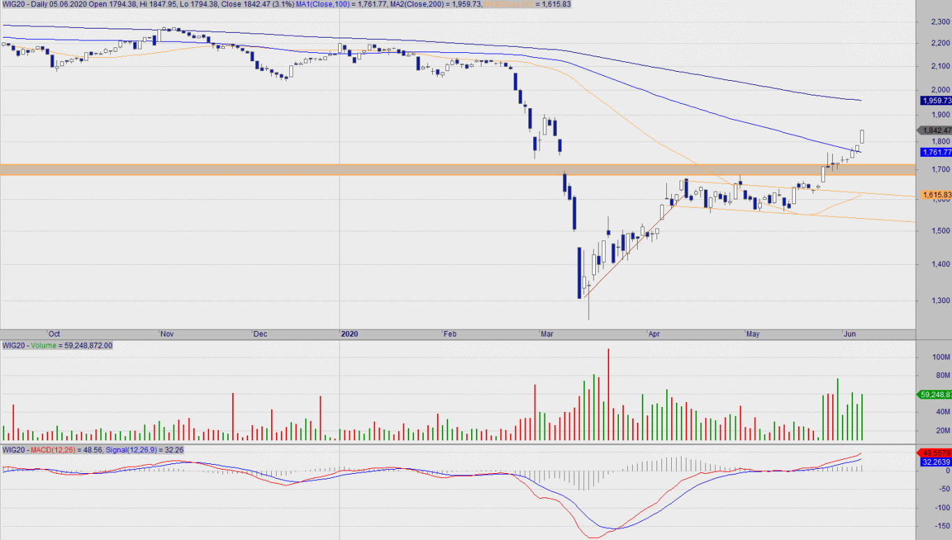 Pionowa ściana w dół, następnie poniowa ściana w górę. Maluchom zajęło 2,5 miesiąca na powrót do notowań przed paniką związaną z koronawirusem. Na powyższym wykresie nadal brak oznak kapitulacji popytu. Magiczne 13.000 pkt zostało zdobyte i raczej kwestią kilku dni będzie wybicie nowego tegorocznego szczytu.