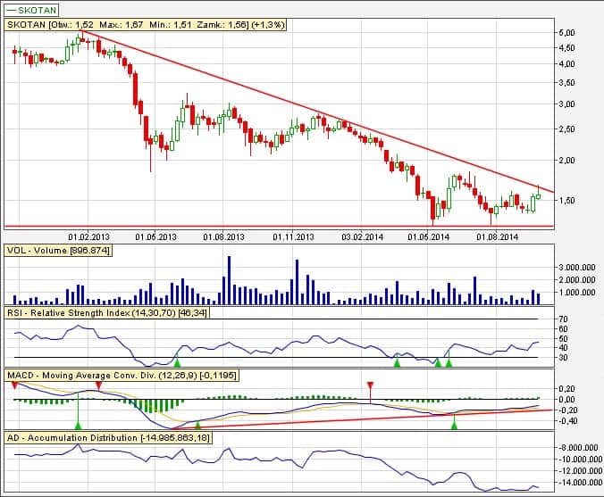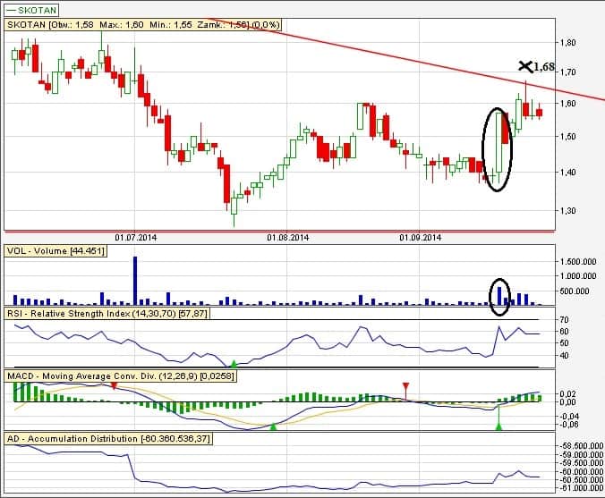 Właśnie ta świeczka z górnym cieniem będzie najbliższym oporem. Przebicie dopiero tej świeczki będzie oznaczać przełamanie linii trendu spadkowego. Jest to punkt 1,68 zł. Spodziewam się tutaj wybicia, gdzie będzie można kilka % zyskać. O zmianie trendu będzie można mówić jednak dopiero po przebiciu oporu na poziomie 1,85 zł (potwierdzenie). Jednak już zagrywać można pod 1,68 zł – będąc jednak bardziej ostrożnym. Przesłanki dla zmiany trendu są widoczne.