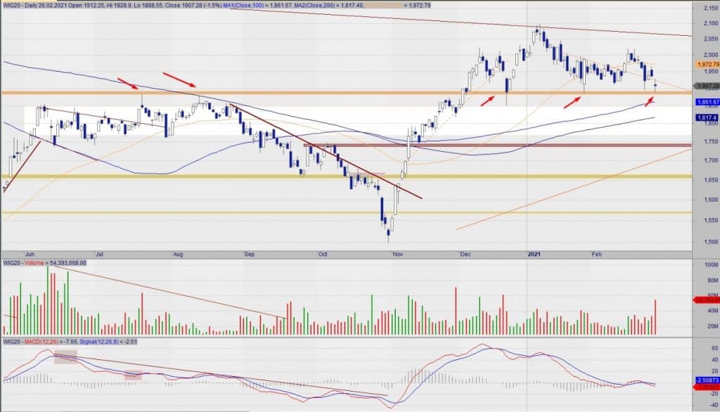 Indeks po wybiciu wsparcia ruchomego na 1970 pkt ponownie ruszył w kierunku kluczowego wsparcia na 1900 pkt. Gdyby miało dojść do wybicia 1900 pkt, które ma istotne znaczenie, to następne wsparcia są na 1850 oraz 1750…