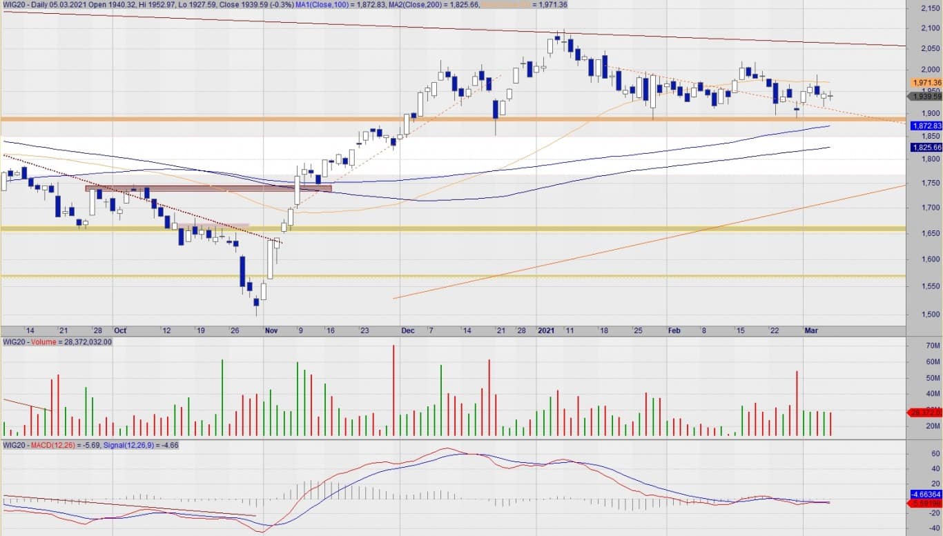 Marazm trwa w najlepsze; nadal czekam na zdecydowany ruch powyżej SMA50 (impuls kupna) lub na wybicie 1900 pkt (impuls sprzedaży). Ewentualny ruch spadkowy po wybiciu 1900 pkt będzie mógłby zatrzymać się przy głównych…