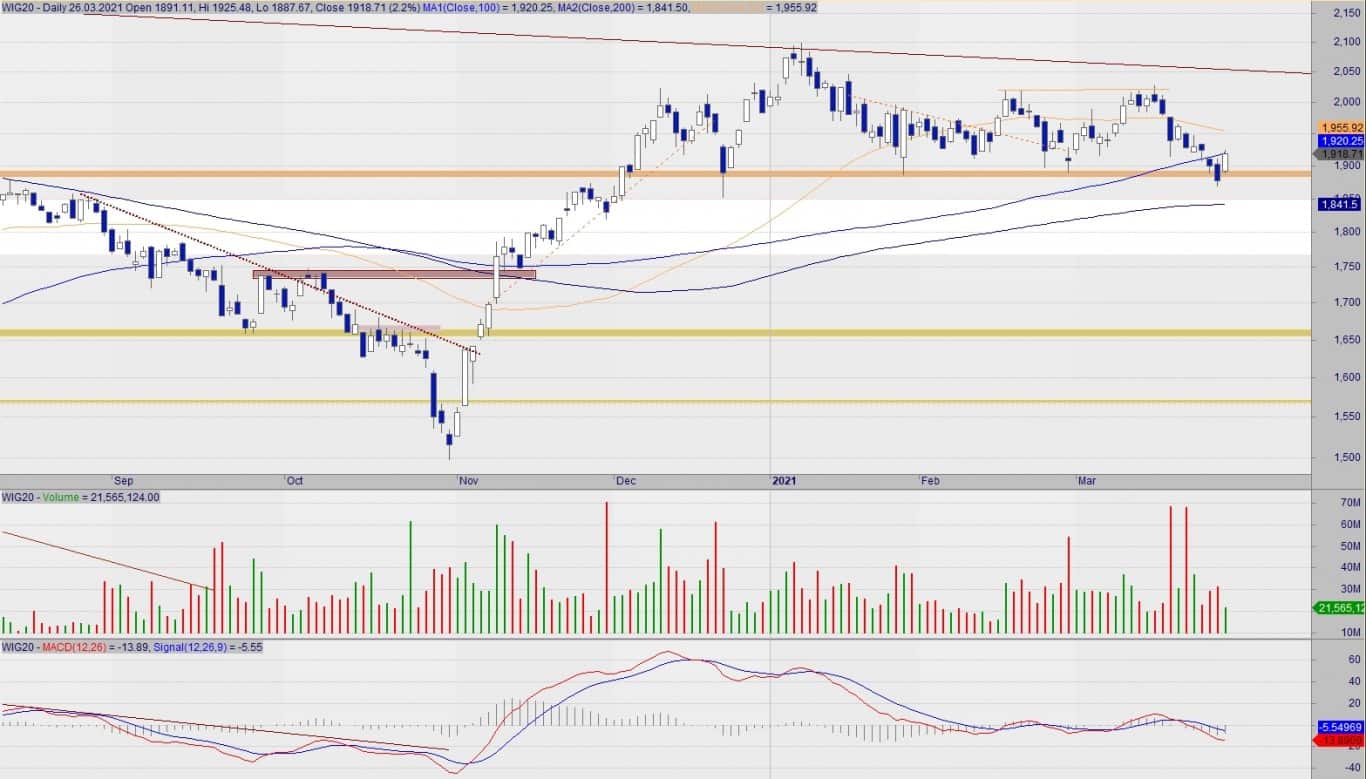 WIG20 potwierdził słabość i wybił się poniżej SMA100. Na wskaźniku MACD nadal utrzymuje się sygnał sprzedaży. W interwale tygodniowym panuje niezdecydowanie – utworzyła się świeca doji. Zerknijmy jeszcze na indeks…