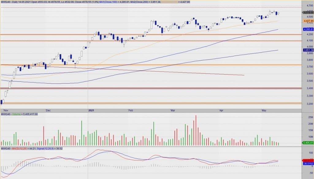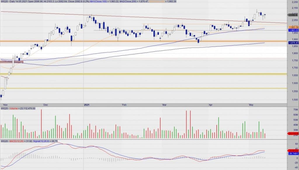 Prowzrostowa sytuacja na wykresie WIG20 nadal trwa, pomimo nieudanego wybicia nad 2100 pkt. Główne wsparcia, to nadal 2030-2020, 2000, 1970 pkt.