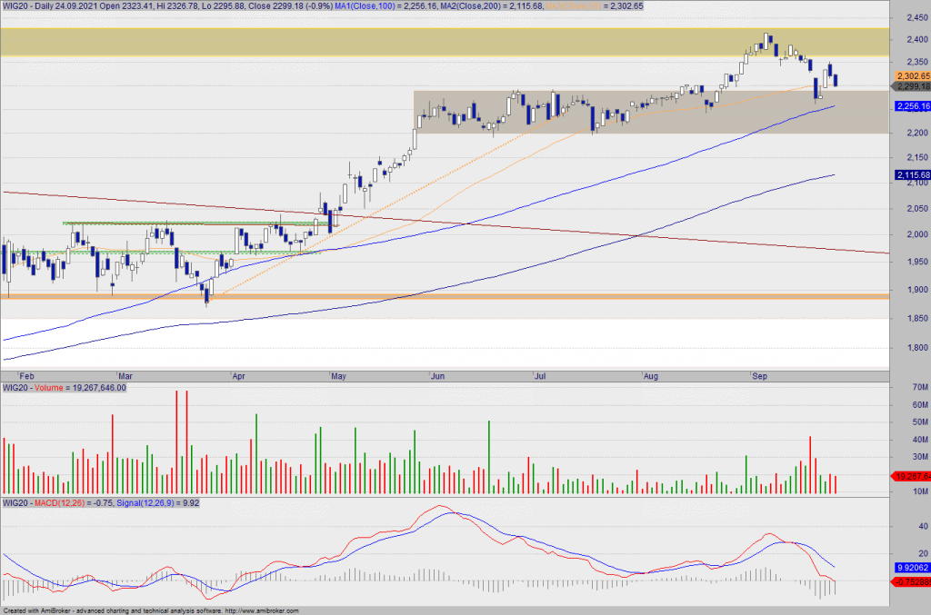 Indeks dotarł do założonego wsparca w obszarze 2285-2300 pkt, gdzie pojawia się spodziewana obrona. Odtąd indeks powinien kontynuować ruch wzrostowy, w innym wypadku – przy wybiciu minimum z 2260 pkt ruch korekcyjny może…