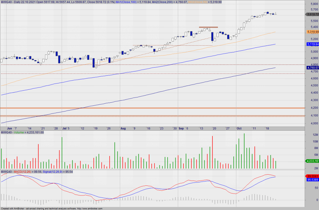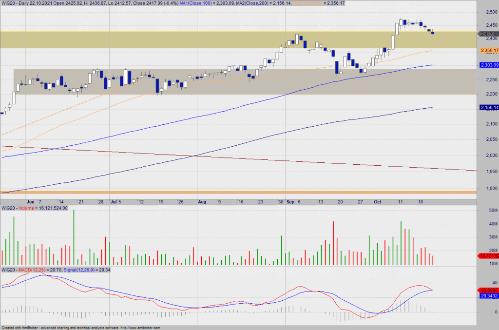 Indeks nadal jest w formie, natomiast po wybiciu wsparcia na 2430 pkt wzrasta ryzyko testu kolejnego wsparcia na 2400, 2365 pkt i 2300 pkt. Teraz najbliższym oporem jest lokalny szczyt na 2470 pkt.