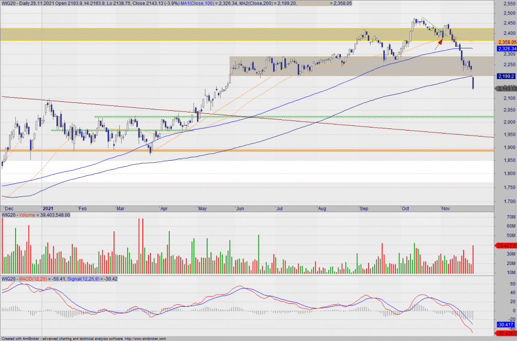 Presja podaży zepchnęła notowania WIG20 na piątkowej sesji (na otwarciu) poniżej SMA200 i w rezultacie indeks ma otwartą drogę w kierunku wspomnianych w ostatnim KzK 2020 pkt. Mozliwe, że przy 2100 pojawi się próba…