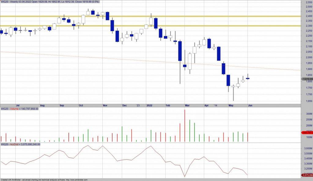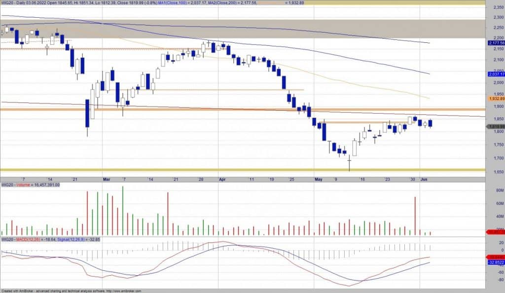WIG20 wybił lokalny opór, ale zaczął cofać się przy 1862 pkt, czyli zabrakło siły do ataku na 1900 pkt. W interwale tygodniowym świece z dłuższymi górnymi knotami sugerują przewagę podaży. W krótkimterminie…